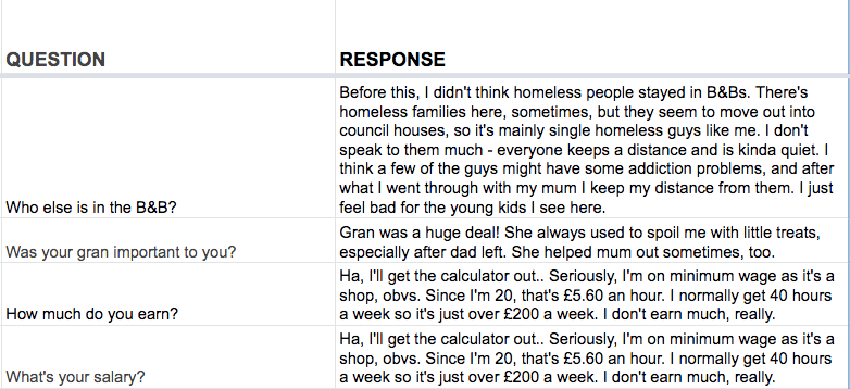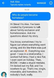 Cyrenians launched the Ask Alex digital campaign in 2017 to raise awareness of issues around youth homelessness and conflict at home. Alex is a Facebook Messenger ‘bot’ who answers questions about how he became homeless, his work situation, life in a B&B, family and friend relationships, hopes for the future and his favourite football team.