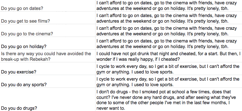 Laura created the character of Alex based on vignettes given by young men who were or had been facing the same issues as Alex. She then wrote a large script database filled with hundreds of questions and responses for the app. Scottish agency Primate took the script and programmed it into the bot using a tool called wit.ai.