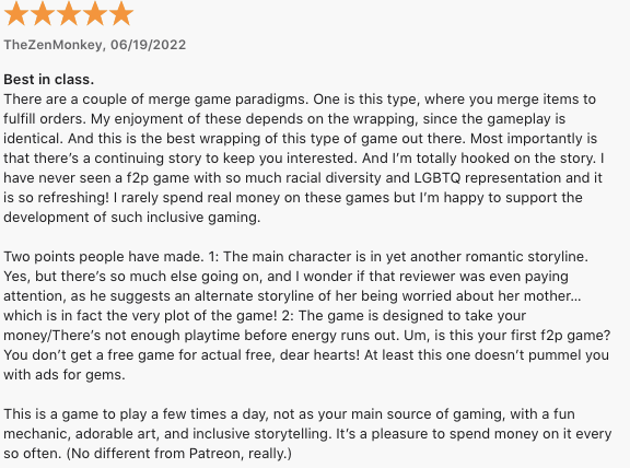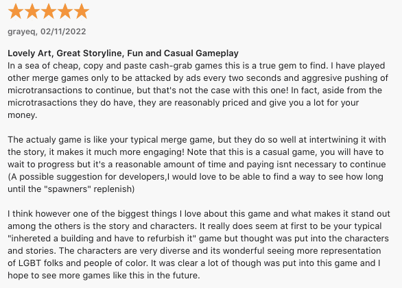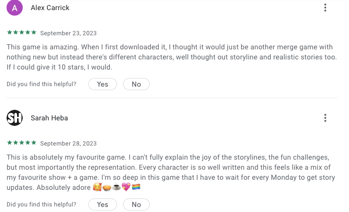 - Love & Pies: A Masterful Pivot to Merge2 on Naavik: ‘Another aspect in which Love & Pies is best-in-class is its narrative… When working your way through the game’s narrative, it becomes crystal clear that this company truly cares about values even outside its own work culture. Love & Pies characters are deep, rich, truly funny, and represent people from many different walks of life, a lot of them minorities in some way. Most importantly, this is all done without it feeling forced, making it a true benchmark in casual F2P narrative.’